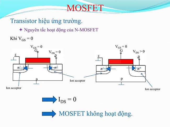 - Không có dòng điện không chạy từ giữ Drain và Source